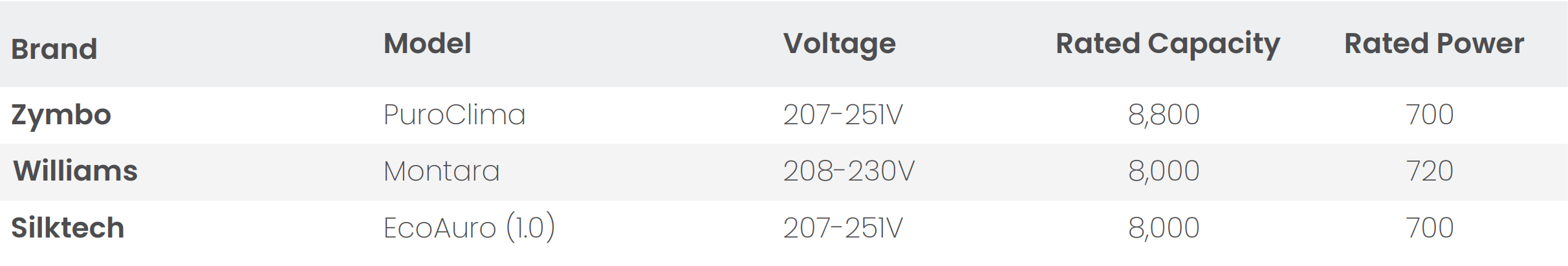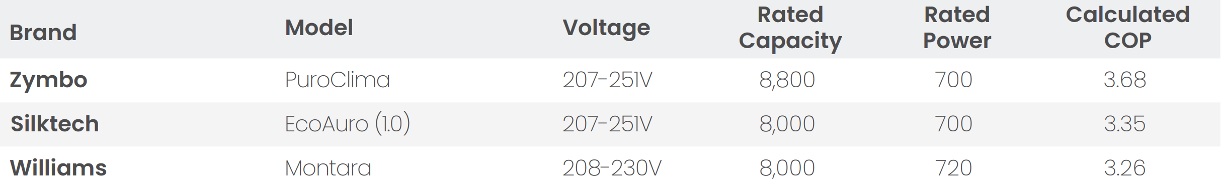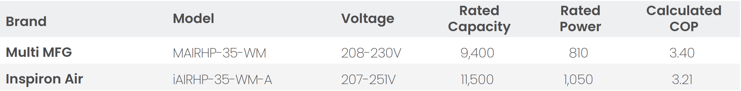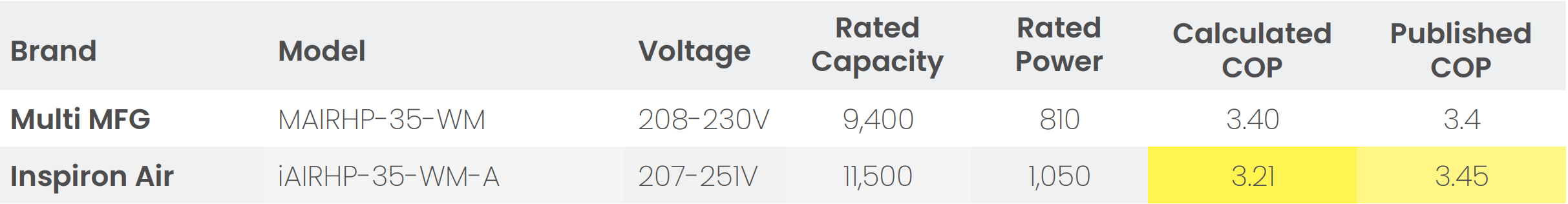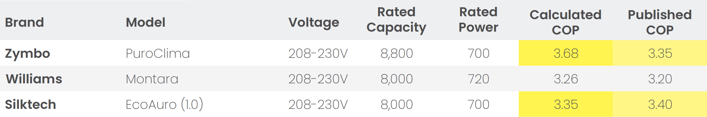 The three brands that publish an HSPF2 all conflict with the data. Does it make sense that Nordica, the manufacturer, claims a 7.5 HSPF2 based on 9,000 BTU, and Ice Air only achieves an extra half point to 8 SEER2 despite losing 1,000 BTU of capacity? This is especially absurd when ICE Air’s COP is 3.5, and Nordica’s is only 2.84? Or even better: are we to believe that Ortech somehow has an 8.29 HSPF2 with 11,970 BTU? These numbers defy basic thermodynamics.